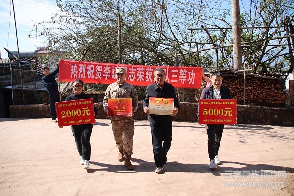 本网讯(文·刀子润 图·浦荣杰)新春将至,岁寒情暖。为大力弘扬“一人立功,全家光荣”拥军优属光荣传统,切实增强现役军人及其家属的荣誉感、获得感和尊崇感,营造全社会关心国防、尊崇军人的浓厚氛围。近日,江城县人武部联合县退役军人事务局组成“送喜小队”,深入乡村社区,开展“立功喜报送到家”暨春节慰问系列活动,为立功受奖现役军人家庭送上喜报、奖励金和新春祝福。