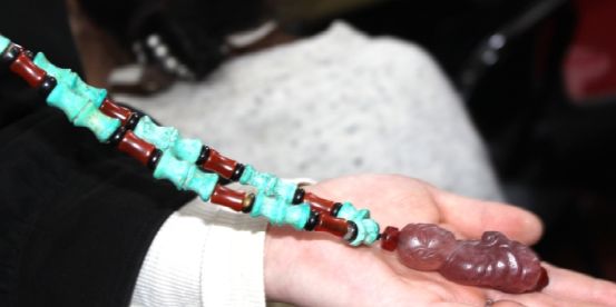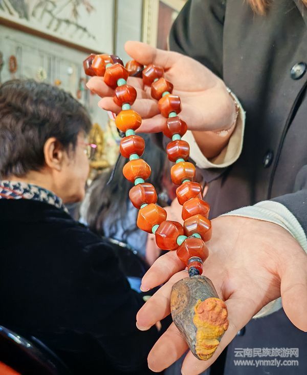 除了传统古玩与名茶,现场还呈现了一系列特色鲜明的珍品,包括纹理天成、寓意吉祥的纯天然玛瑙奇石挂件(A/B/C三款);雕工精湛、栩栩如生的巴西橄榄核手工十八罗汉手串;质朴实用的现代乌龟手抓壶;稀少珍贵的民国七零菩提手串与明清四棱菩提手持;意趣盎然的纯天然三十年红果红如意摆件;以及彰显权贵的辽金时期和田青玉如意纹斧型佩与象征尊贵的滇玉国竹节绿松石配碧玉佛像项链,均引发了现场及线上观众的浓厚兴趣。