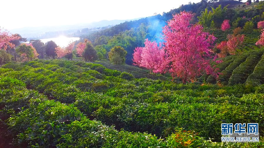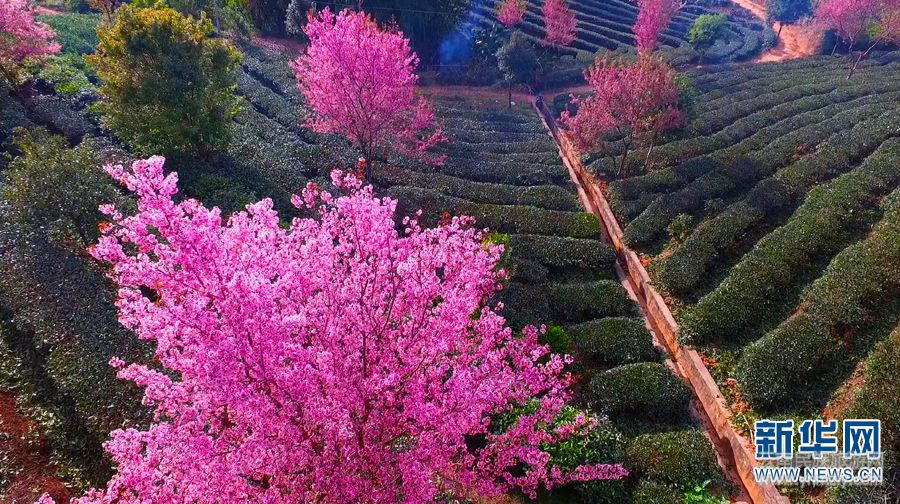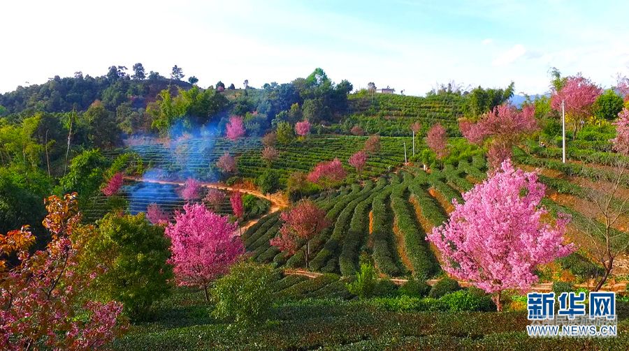 每年初春,云南省普洱市万亩茶园内的樱花进入盛开期,怒放的樱花遍布茶山,在茶树的衬托下,更加妩媚动人,花香、茶香交织飘悠,沁人心脾。(新华网发)