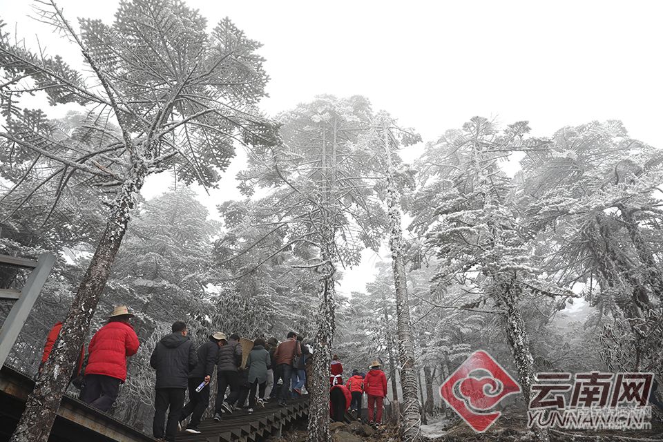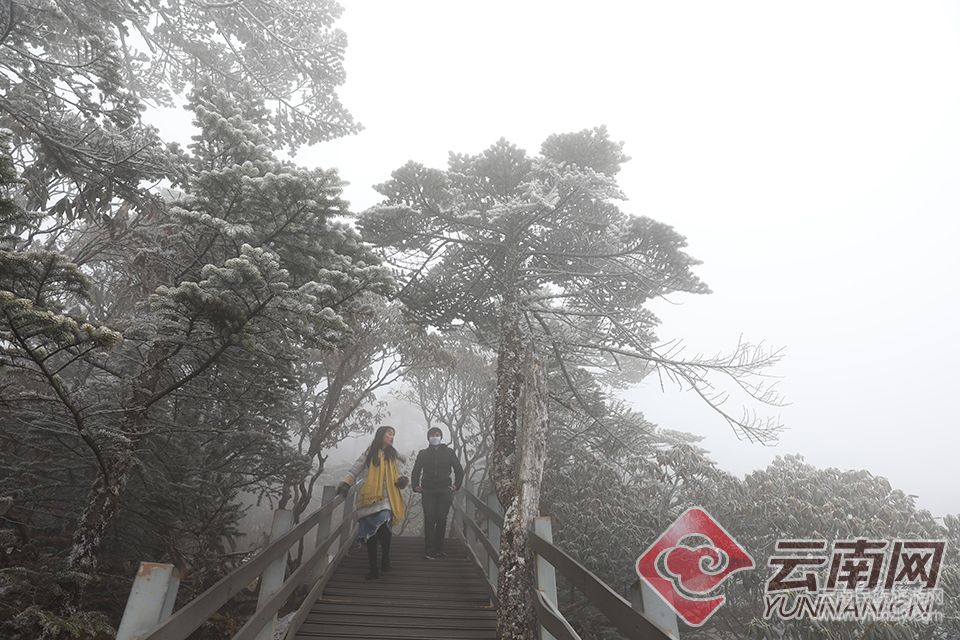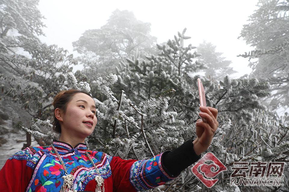 3月10日,昆明轿子山出现了春季罕见的雾凇。晶莹闪烁的“冰花”挂满枝头,吸引了不少游客观赏拍照。
