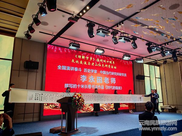 会上展示了黄光汉将军和陶昌廉将军书法题词,展示广东演讲学会书法条幅;展示了全国演讲泰斗,历史学家,中国当代研究所研究员李永田老师撰写的十米长卷书法作品《时代的强音》。