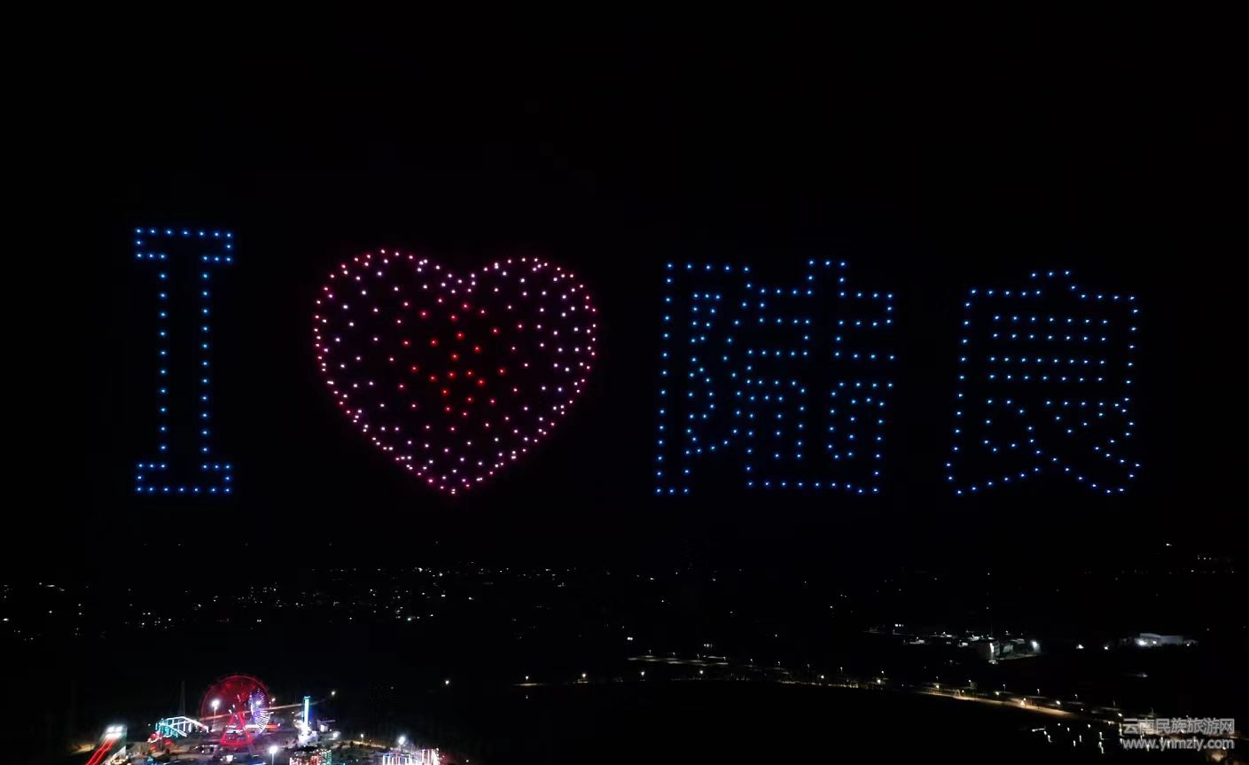 打铁花表演余热未消,千架无人机编队升空,以夜空为幕、灯光为笔,依次变换出骏马、“马年吉祥”字样、爨文化图腾等造型,与地面铁花星火相互呼应,实现传统年味与科技感的完美融合。当“我爱陆良”“滇中健康城”光影字样定格夜空时,现场氛围达到高潮,掌声与欢呼声经久不息。据景区负责人介绍,大年初一单日接待游客超3万人次,活动期间还同步推出摩托艇巡游等配套项目,让市民游客尽享别样年味。