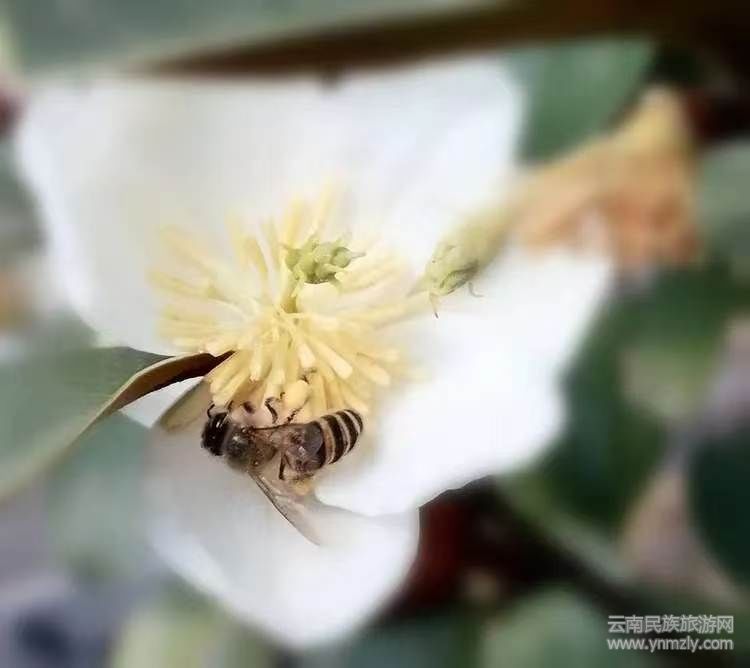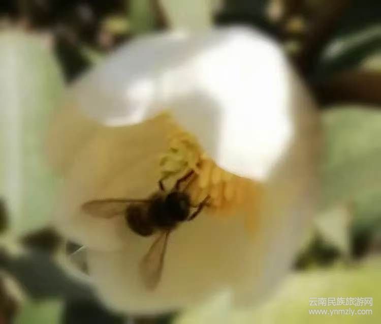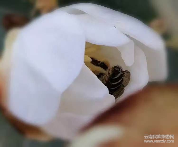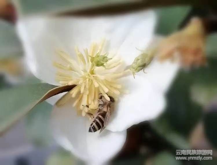 蜜蜂对云南含笑的一往情深,尽在倾心采花蜜中。